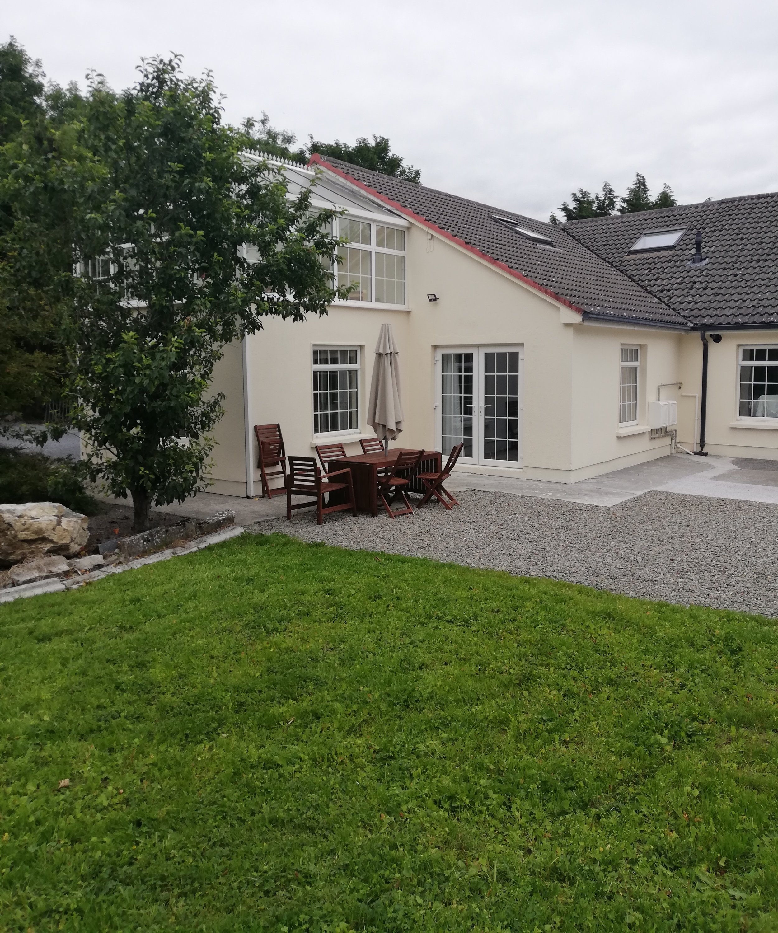 Three bedrooms sleep six comfortably across a double en-suite master, a second double, and a twin room, with a large walk-in shower in the main bathroom. Patio doors open from the living area directly onto a gravel terrace with rattan dining furniture — sheltered enough to use in most Galway weather. Above, a full-height glazed conservatory looks out over the mature garden, with a dedicated relaxation room below it for quieter moments.
