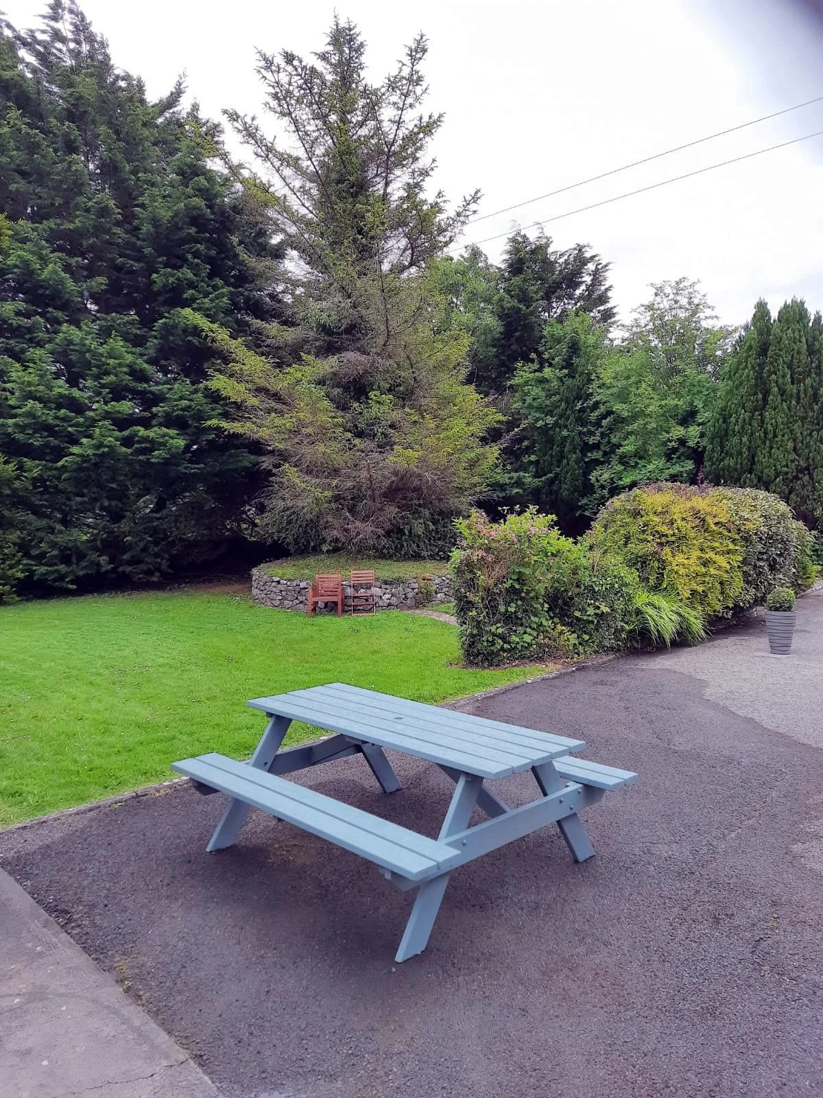 The lodge has two bedrooms, two bathrooms, a fully equipped kitchen and a dedicated workspace with the fastest WiFi on the property. The garden and picnic bench outside are yours to use — a quiet spot that catches the afternoon sun.